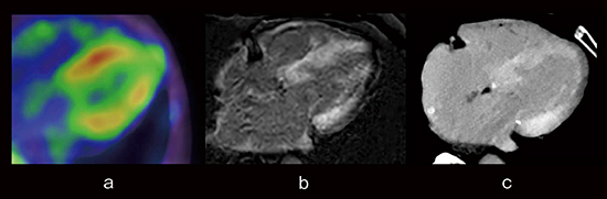 図5の症例は,心アミロイドーシスである。ピロリン酸シンチグラフィ(図5 a),CMR-LGE(図5 b)においてびまん性に肥厚した心筋の線維化組織が明瞭に観察でき,IQonの遅延造影画像(図5 c)でも同様の画像所見を認める。