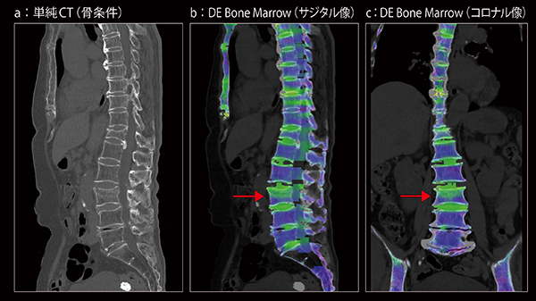 82歳,女性。ベッドから転落し腰背部痛にて救急受診。圧迫骨折疑いにて第5胸椎〜仙骨の広範囲のCT撮影依頼があった。SOMATOM X.citeでは,Dual Energy CTに,“TwinBeam Dual Energy”と“TwinSpiral Dual Energy”の2方式を使用できるが,椎体は呼吸性移動が少ない部分であるので,エネルギー弁別に優れるTwinSpiral Dual Energyで撮影した。骨条件画像では第12胸椎と第3腰椎に変形を認める。DE Bone Marrow画像では第3腰椎(→)に信号値の上昇を認め,第3腰椎の新鮮圧迫骨折と診断された。