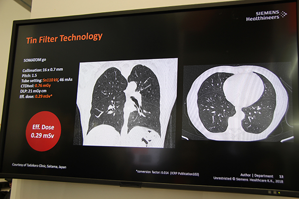 さらに,両機種ともに,X線スペクトラムの最適化を図る技術として,フィルタの素材にスズ(Sn)を用いた“Tin filter technology”を搭載。従来に比べ大幅な被ばく低減を実現し,胸部単純X線撮影と同等の被ばく線量で高画質画像を得られるようにした。このTin filter technologyは,今後発表されるシーメンスのCT装置にはすべて搭載される予定である。