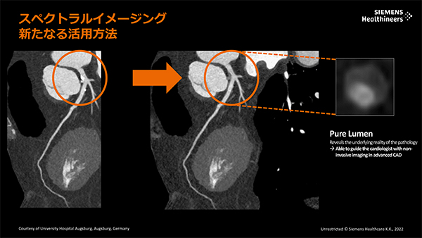 NAEOTOM Alphaによるスペクトラルイメージングは,dual energy CTによるスペクトラルイメージングと比べて高画質化が可能なことに加え,Dual Sourceを用いた66ms(ハーフ再構成)の高時間分解能を実現している点も臨床上大きな意味を持つ。秒間72cmの広範囲CTAや息止め不可患者,高心拍,小児などのスペクトラルイメージングを実現し,診療における意思決定を支援する。展示では,スペクトラルイメージングと高時間分解能を生かした活用法として,冠動脈の石灰化部分を表現しない画像を再構成するPURE Lumen(純粋な内腔)を紹介し,重度石灰化症例でも冠動脈CTAが可能なことをアピールした。