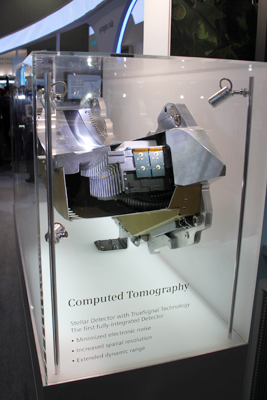 また,ハイエンドのSOMATOM Definition Flash,SOMATOM Definition Edgeに搭載されている次世代型検出器「Stellar Detector」も展示された。フルデジタル化することで電子ノイズやクロストークを抑え,低線量で高画質の撮影を可能にする。同社では,逐次近似画像再構成技術だけでなく,Stellar Detectorなどハードウエアからもアプローチすることで,低電圧撮影が可能になり最適な線量で最高のイメージクォリティが得られることをアピールした。