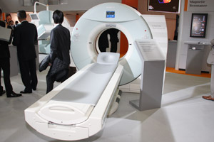 CTは今回,同社がこれまでに取り組んできた被ばく低減技術の研究成果が大きな年表として掲示され,“Low Dose CT”が最大のテーマとなった。中でも最新の被ばく低減技術である,逐次近似法に属した反復画像再構成法の“IRIS(Iterative Reconstruction in Image Space)”では,従来と同じ線量であれば画質を大幅に向上し,従来と同じ画質であれば被ばく線量を最大60%低減することが可能となる。IRISが搭載された新製品として,今年3月に「SOMATOM Definition AS IRIS」の販売が開始された。このほか,スパイラルスキャン時に発生する不要な放射線を遮断する“Adaptive Dose Shield”が展示され,放射線を遮断する際のシールドの動きが見られるようになっていた。