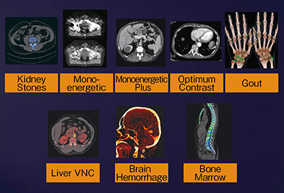 syngo.viaには多くのアプリケーションが搭載されているが,そのうちSingle Source CTによるDual Energy Imagingの解析処理に用いられるものを図2に示す。一般的に,腎結石を解析する“Kidney Stones”や,金属アーチファクトを軽減する“Monoenergetic”などがよく用いられる。