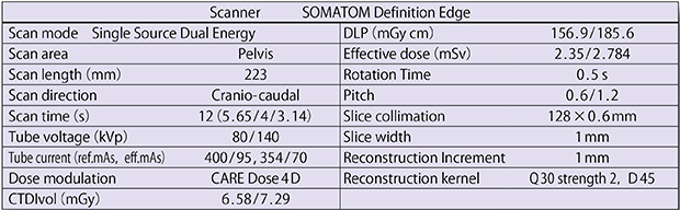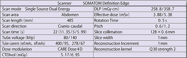 SOMATOM Definition EdgeによるDual Energy Imagingは,0.6mm×128列で撮影を行う。FoVは500mmが可能なため,肩や骨盤内,撮影中心から離れた部位にも適応可能である。撮影は,1回目のスキャンを80kVで行い,連続して寝台移動後に2回目の撮影を140kVで行うが,20cmを約10秒,40cmを約20秒で施行可能であり,通常の息止めの範囲内で,120kVpの撮影と同等の被ばく線量でDual Energy Imagingを行うことができる(図1)。スキャンを2回行うことによる被ばくの増大は,自動管電流調整機構“CARE Dose4D”,raw dataを使用したモデルベース逐次近似画像再構成法“SAFIRE”,次世代型検出器“Stellar Detector”などの被ばく低減機構により,従来の1回撮影と同等の被ばく線量での撮影を可能としている。さらに,2回目の撮影ではピッチを2倍にするため,全体的な撮影時間はあまり延長しない。