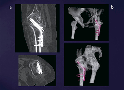 症例1は,60歳代,女性,大腿骨頸部骨折。かなり厚い金属プレートで骨折部位が固定されているが,その骨癒合の状態の評価のためにDual Energy CTが施行された。撮影パラメータを図3に示す。monoenergetic image(図4a)では,金属アーチファクトが大幅に軽減した画像が得られ,自動作成される3D画像(図4b)と併せて診断可能である。