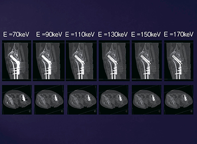 金属アーチファクトの軽減に用いられるmonoenergetic image(monochromatic image,仮想単色X線画像)は,80kVと140kVの画像から任意のエネルギー(40〜190keV)に相当する仮想的なイメージを作成する技術である。金属アーチファクトは,金属を通過する際に高エネルギー成分が残り,低エネルギー成分を吸収(ビームハードニング)することで生じるが,monoenergetic imageによって大幅に軽減することができる。通常,100〜140keVが良好であるが,syngo.viaではスライディングバーで画像を動かしながら,アーチファクトの少ない最適なエネルギーでの画像を確認し,リアルタイムに診断することができる。