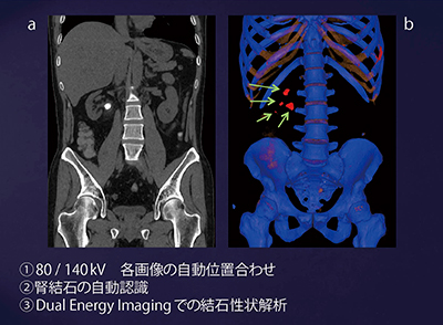 腎結石にはさまざまな種類があるが,Dual Energy Imagingでその性状を分析することができる。なかでも,尿酸結石は薬物治療が可能なため,性状を分析することは臨床的にも意義が大きい。