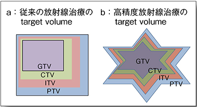 放射線治療計画は現在,CT画像を用いて行われているが,最近ではMRIやPETとのフュージョン画像によるプランニングで,転移性脳腫瘍や複数病巣の治療も行われるようになっている。放射線治療を行う上で知っておかなければならないのは,target volumeの定義である(図1)。画像などで肉眼的に病変の有無が確認可能な肉眼的腫瘍体積(GTV)に対し,予防的に照射する領域も含めた臨床標的体積(CTV),呼吸などによる腫瘍の位置ズレを考慮し,インターナルマージンを含めた標的体積(ITV),複数回の照射における患者のセットアップポジションも含めた計画標的体積(PTV)があり,実際の治療ではPTVまでをきちんと照射する必要がある(図1a)。