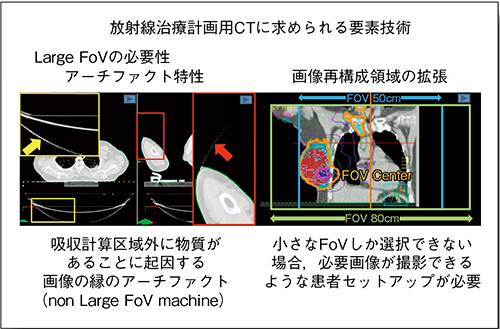 RT Pro editionは,通常のFoVよりも広いエリアの画像化が可能な“HD FoV Pro”,テーブル制御の高精度化,金属アーチファクト低減画像再構成機能“MARIS”などの放射線治療計画用の機能を有する。一般的なCT装置のFoVは50cmであるが,RT Pro editionではHD FoV Proと,スキャン面内を均一にサンプリングする独自の電磁焦点偏向システム“Flying Focal Spot”により,80cmという広いガントリ開口径に一致した80cmのFoVを実現している。開口径の狭いCTでは,吸収計算区域外に物質があることに起因するアーチファクトが生じるほか,従来のFoVサイズでは適切な画像を撮影するための患者セットアップが必要となるが,Large FoVによりこれらの問題が解消される(図2)。