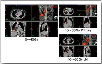 症例1は,76歳,女性。小細胞肺癌(cT3N1M0,右下葉原発)のため化学療法が行われたが,制御不良であったため放射線治療(CBDCA+VP-16併用,60Gy/30回)が施行された。はじめに4D-CTにてITVを決定するが,4D-CTから得られる呼気相と吸気相の画像をPET画像とフュージョンすると,全相においてほぼ一致していることが認められる(図4)。ITVはすでに決定しているので,これを基にPTVを設定すれば,動きのある領域の腫瘍であっても,きわめて高精度な照射が可能となる。図5は実際の治療計画である。肺がんの場合,主腫瘍とリンパ節転移は呼吸による動きが異なるが,4D-CT画像を用い,それぞれに最適なフィールド設定が可能であり,適切な照射が可能となる。本症例は,治療1か月後の画像にて著明な腫瘍縮小が認められた。
