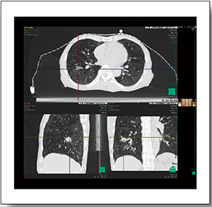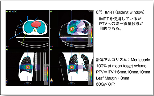 症例2は,75歳,男性。健診にて右中肺野に腺癌(cT1aN0M0,右下葉原発)が認められたが,肺機能の低下により手術非適応となり,定位放射線治療が施行された(60Gy/8回)。本症例は,本来は動きの大きい部位の腫瘍であるが,体幹部固定用シェルを用いたことで動きが少ないことが,4D-CTにより確認された(図6)。この画像を基にITVを設定して治療計画を行い,PTVへの均一な線量投与を目的にIMRTを施行した(図7)。本症例は,治療3か月後の画像にて著明な腫瘍縮小が認められた。