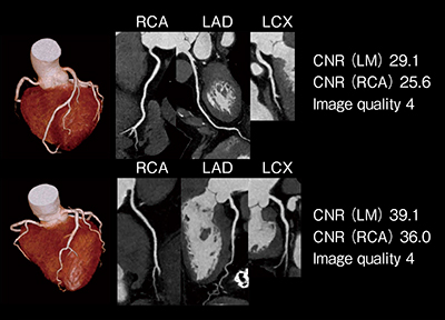 上記の課題のうち,造影剤量については前述のとおり,CARE kVを用いて80kVもしくは100kVで撮影することで約44mLに低減できる。また,Coronary CTAの被ばく線量は,Flash Spiral Cardio Modeでは0.6mSv,Normal Modeでは5.1mSvでの撮影が可能である。さらにDefinition Flash導入当初は,DS Chest Pain Modeにて冠動脈のpitch factorに合わせて一括撮影を行っていたが,被ばく線量が約40mSvだったため,現在は冠動脈と腎動脈・下肢動脈を分けて撮影することで被ばく低減を図っている。