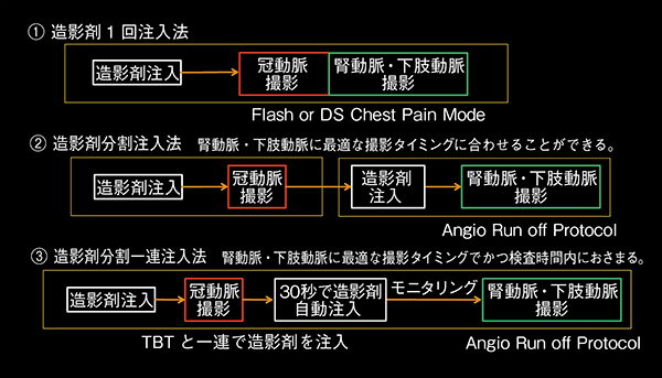 図2 冠動脈・腎動脈・下肢動脈CTA一括撮影における造影剤注入法の変遷