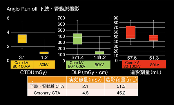 2013年9月〜2014年6月までにCoronary CTAを施行した763例のうち,腎動脈・下肢動脈CTAを追加した連続97例について,80 or 100kVで撮影した群と80kVで統一した群の2群に分けて,被ばく線量や造影剤量について検討した。その結果,被ばく線量は,80 or 100kV群のCoronary CTAが4.3mSv,腎動脈・下肢動脈CTAが5.6mSv,計約10mSvであったのに対し,80kV群のCoronary CTAは4.8mSv,腎動脈・下肢動脈CTAは2.1mSvとなり,計約7mSvに低減できた。造影剤量も57.6mLから51.3mLに低減された(図4)。また,CT値では両群の造影効果に差はなく,SDについては80kVの方が腹部で若干高かったものの,CNRおよび視覚による画質評価で有意差は認められなかった。