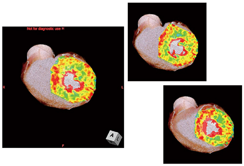 57歳,女性。負荷Dynamic CTPでは全体に心筋の信号が均一で非常に安定している(図1)。また,Definition Flashのコンソールに搭載されたソフトウェア“syngo Volume Perfusion”により,5分程度の解析でVoxel-wise MBF mapを作成することができる。これをCTAとフュージョンすることで冠動脈の支配域と,その血流状態が明瞭に把握可能であり,正常例では外膜側と比べると内膜側に向かってグラディエントのついた心筋血流値となっているのがわかる(図2)。遅延造影CTでも,全体に均一なCT値が得られている(図3)。