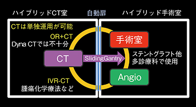 病院新築にあたって,新病院の核となる施設としてハイブリッドORの導入が検討された。しかし,ハイブリッドORの主な対象となるステントグラフト留置術の当院での件数は月間2,3件程度で,稼働率の点で問題がある。そこで,多診療科での使用を視野に入れヒアリングを行ったところ,脳神経外科から手術室へのCTの導入は必須との要望が上がった。手術室専用CTの導入は,当院のような中規模病院では実現困難とあきらめかけたところ,シーメンスから2-ROOM仕様のSliding Gantry CT導入の提案があった。シーメンスのSliding Gantry CTは,CTガントリの長距離移動が可能で,ハイブリッドORとCTを分離し独立したモダリティとして運用することで,機器の有効活用が期待できる。