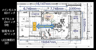 さまざまな検討の結果,手術室(9室),血管撮影室(5室),ICU,HCUなどが入る4階フロアのレイアウトを見直し,血管撮影装置Artis zeegoとMAQUET社製の手術台「MAGNUS」を組み合わせたハイブリッドOR室を設置。その隣室をCT室とし,Sliding Gantry機構を備えたSOMATOM Definition AS+を導入して,“ハイブリッドOR 2-ROOM仕様”を構築した(図1,2)。