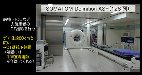 CTは,ハイブリッドORでの撮影が必要になった時に,ガントリが6mの距離を自走して隣のCT室から移動する。床に埋め込まれたレールはフラットで処置や手技の邪魔にならず,移動もスムーズである。ハイブリッドOR室との間の自動扉を閉めることで,CT単独での運用が可能であり(ハイブリッドCT室),病棟やICUの入院患者の撮影を行っている(図3)。SOMATOM Definition AS+はボア径が約80cmと広く,人工呼吸器や輸液チューブが装着された重症患者の撮影やCT透視下処置も問題なく行える。