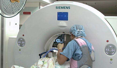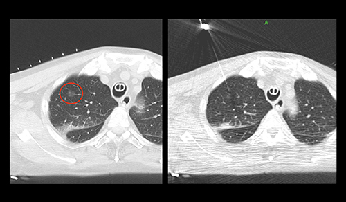 Artis zeegoの術中コーンビームCT(syngo DynaCT)は有益なデータを提供するが,密度分解能が格段に高いCTの臨床でのメリットは大きい。脳神経外科では,急性硬膜下血腫の手術の際に,開頭したままCT撮影を行い,血腫の取り残しなどを確認して進めている(図4)。呼吸器外科では,“全身麻酔下肺腫瘍マーキング”(図5,6)を行っている。通常であればCT室で局所麻酔による穿刺,胸腔鏡下手術(VATS)用のVATSマーカーの留置や色素によるマーキングを行い,その後手術室に移動して全身麻酔となる。当院では全身麻酔後にCT透視下マーキングが可能で,患者への負担も軽減できる。また,肝臓外科の直腸がん肝転移巣の切除では,化学療法が著効し,エコーなどの画像上で確認できなくなった腫瘍を切除する際に,開腹して肝臓の腫瘍があると思われる部分に直接針を穿刺し,その状態で術中CTを撮影。針の位置を目安として肝腫瘍の切除術を行っている。