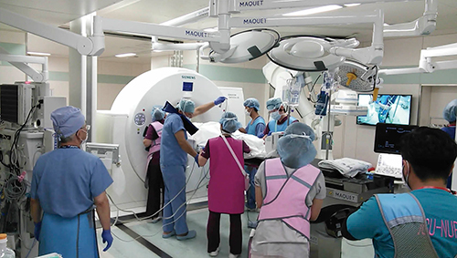 ハイブリッドERでは,Sliding Gantry CTによる造影CT,Artis zeegoによる血管造影,血管塞栓,手術室環境での開頭,開胸,開腹,骨接合の手術を,患者搬送後,ベッドから移動することなく実施できる。手術室であるからこそ,モニタ管理や全身麻酔に熟練したスタッフと資機材が完備された状態で行えることが,手術室にハイブリッドERがあるメリットと言える。