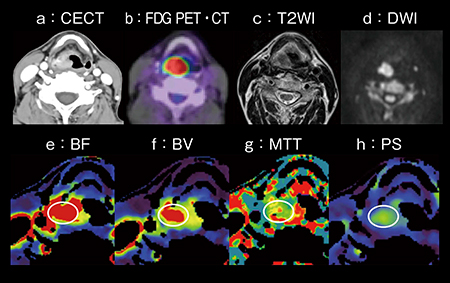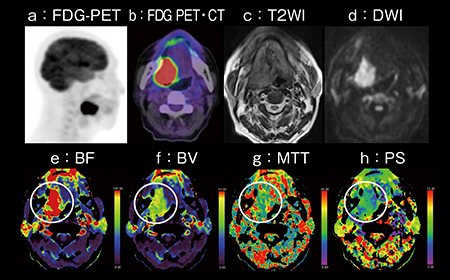 症例2(図3)は,右下咽頭がん梨状陥凹型(cT2N1M0)である。PET・CT(図3 b)にて強い集積が認められ,MRIのDWI(図3 d)では全体的に高信号で均一な印象であるが,Perfusion CTではBV(図3 f)にて血流の非常に多い部分が認められた。同部はPS(図3 h)とBF(図3 e)も高く,MTT(図3 g)は短縮していたことから,細胞の増殖が活発で,悪性度の高い部位であると判断できる。腫瘍内の悪性度の不均一が確認できれば,放射線治療計画におけるより適切な線量分布設定に貢献すると思われる。