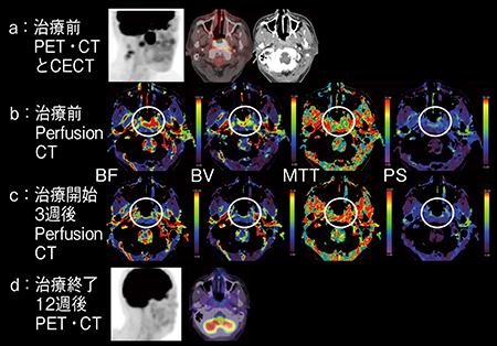 症例3(図4)は,上咽頭がん(cT4N2M0)である。治療前PET・CTと造影CT(図4 a)にて強い集積が認められ,治療前Perfusion CT(図4 b)では血流の増加が確認できる。化学放射線療法開始3週間後のPerfusion CT(図4 c)では,腫瘍サイズが縮小して血流が低下しており,治療前に血流の豊富な症例は治療効果が高いことが確認できた。