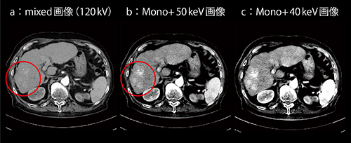 症例1(図1)は,超高齢者の肝細胞がん症例で,造影剤を大幅に低減して撮影を行った(300mgI/mL造影剤を50mL投与)。同一WL/WWで表示したMono+の50keV画像(図1 b)と40keV画像(図1 c)は,mixed画像(図1 a)と比較して,病変部が高吸収域として明瞭に描出されており,病変を正確に同定できる。