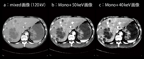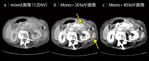がん診療では,播種や転移病変にも注意が必要である。症例3(図3)は,胃がんの多発性腹膜播種症例であるが,Mono+の50keV画像(b)と40keV画像(c)では播種が高吸収に描出されており,120kV画像では検出が困難な病変もMono+では容易に指摘することができる。