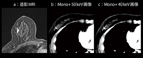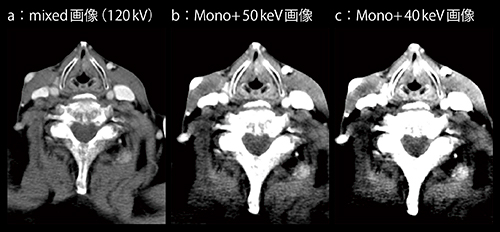 Mono+は,小さな多血性腫瘍の存在診断,進展度診断でも有用である。症例4(図4)は,乳がん症例で,原発巣,乳管内進展については造影MRI(a)が有用だが,Mono+の50keV画像(b)と40keV画像(c)でも明瞭に描出できている。また,症例5(図5)は,喉頭がん症例で,mixed画像(a)では声門の小さな腫瘤が不明瞭であるが,Mono+画像(b,c)では良好に見えている。このことからも,Mono+を追加する意義は大きい。