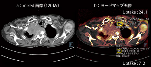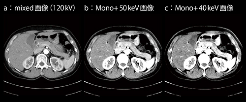 なお,Mono+では,腎機能保護を目的として,コントラストの上昇を造影剤量の低減として還元することも可能である。がん診療では化学療法や造影CT検査を頻回に受けている高齢の患者も多いので,可能なかぎり造影剤を低減することが重要であり,Mono+の価値は高い。