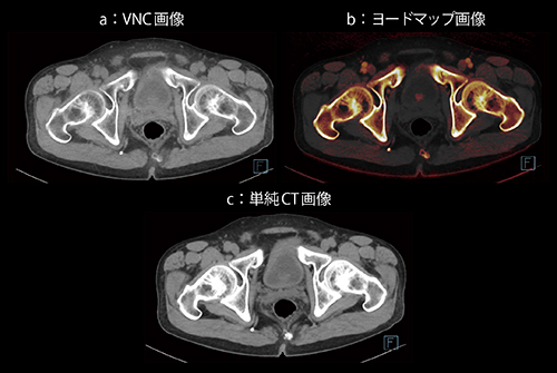 症例7は膀胱がん症例(図7)である。VNC画像(図7 a)では尿よりも腫瘍が少し高吸収に描出され,ヨードマップ画像(図7 b)では明らかな造影剤の取り込みを確認できた。さらに,併せて撮影した単純CT画像(図7 c)とVNC画像(図7 a)を比較したところ,遜色のない画像が得られていたことから,被ばく低減の観点からはVNC画像のみにすることも可能と考えられる。