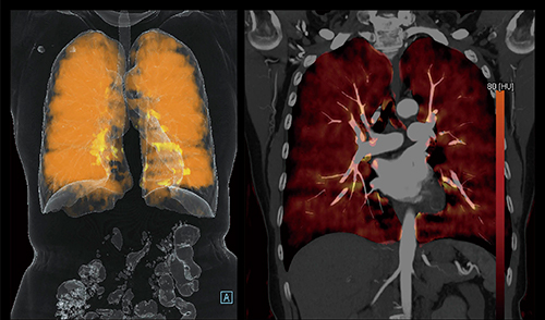 “DE Lung PBV(Lung Perfused Blood Volume”画像は,肺実質のヨードマップ画像とCT画像をフュージョンして,仮想肺血流シンチグラフィ画像も作成できる(図9)。肺動脈の塞栓や腫瘍による肺血流の低下,手術時の残存肺血流量の推定などに有用と考えられる。