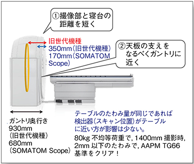 また,たわみについては,画像誘導放射線治療で照射野が小さい場合は,ポータルイメージなどを確認して補正できるため,大きな問題とはならない。しかし,照射野が長く,特に側面方向から照射する場合は,たわみが大きく影響する。そこで,SOMATOM Scopeでは,旧世代機種よりもガントリの奥行きを短くすることで撮影部と寝台の距離を短くし,かつ天板の支えをガントリに近づけることで,たわみを大幅に低減している(図2)。80kg不均等荷重で1400mm撮影時のたわみは2mm以下に規定されているAAPM(米国医学物理学会)TG66基準をクリアしており,実測でのたわみは1mmにも満たない。