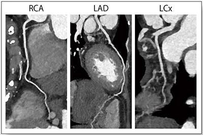 SOMATOM Driveの75msという高い時間分解能は,心臓撮影において非常に威力を発揮する。症例2は,虚血性心疾患疑いの症例であるが,心拍数が100bpmほどであっても,拍動の影響が非常に少ない画像を得ることができている(図2)。
