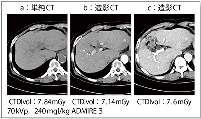 症例3(図3)は肝細胞がん治療後の症例である。腎機能障害のため70kV,240mgI/kgにて撮影を行った。外側区域に単純CT(図3 a)で低吸収,造影CT(図3 b,c)ではearly enhancementを示す腫瘍が認められ,再発が疑われた。70kV撮影,240mgl/kgの造影剤量でも,腫瘍,大動脈,門脈の造影効果は十分に得られ,被ばく線量も通常の120kV撮影と比べ40%ほどに抑えられている。