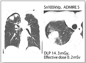 症例4は,原発性肺がん疑いで当センターにて肺生検を施行し,翌日にTin filterプロトコルで気胸のフォローアップ撮影を行った。胸部単純X線を数枚撮影した程度の線量で明瞭な画像を得られている(図4)。現在当センターでは,肺生検後のフォローアップはすべてSOMATOM DriveのTin filterプロトコルで実施している。
