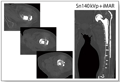 症例5は左人工骨頭ステム周囲骨折術後で,仮骨の状況などを詳細に観察するためCTを撮影した。iMARによりアーチファクトが抑制され,非常にクリアで評価しやすい画像を得ることができた(図5)。
