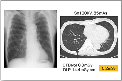 症例1は,60歳代,男性。胸部単純X線写真では異常は認められないが,実効線量0.2mSvの超低線量CTにて微小病変が認められた(図1↑)。胸部単純X線写真では検出が困難な,臓器に隠れた領域の病変検出能は,CTの方がかなり優れている。CTDIvol 0.3mGyと低被ばくでありながら,このような良好な画像が得られることを考えると,将来的には超低線量CTにて胸部のスクリーニングを行う時代が来ると思われる。