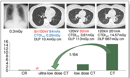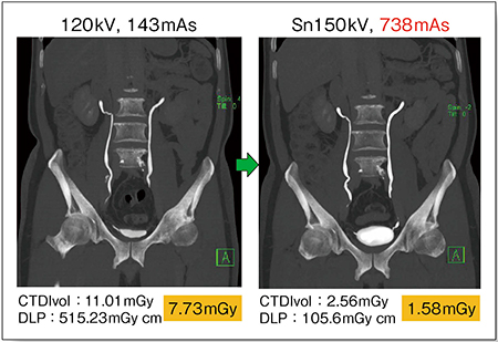 CTにおける被ばく低減技術は,Low-kVあるいはLow-mAを用いる方法が主流である。当院の胸部CT撮影における被ばく線量の変遷を見ると,かつては120kV,201mAでCTDIvol 14.57mGyであったものが,120kV,50mAのLow-mA撮影によって3.61mGyへ,さらに,SOMATOM ForceのTin filterプロトコルでは,Sn100kV,262mAで0.91mGyへと