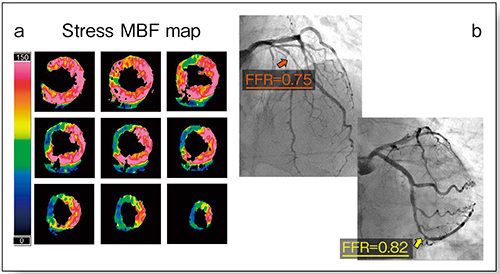 症例1(70歳,男性)は狭心症で,冠動脈CTでは左前下行枝(LAD)に石灰化があり,左回旋枝(LCX)に中等度狭窄が疑われた。MBFマップでは,LAD領域である前壁中隔領域の血流低下が認められたが,LCX領域の血流低下は認められなかった(図1 a)。後日施行された冠動脈造影とFFRでは,MBFマップと一致する結果が得られた(図1 b)。