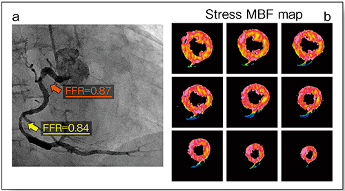 症例2(64歳,女性)は,冠動脈CTで右冠動脈(RCA)に石灰化による中等度狭窄と非石灰化プラークによる中等度狭窄が認められた。診断ガイドライン6)では,このような判定困難な症例に対しては,SPECTやMRIなど非侵襲的なモダリティで虚血を評価することが推奨されている。本症例は,冠動脈造影での侵襲的FFRで虚血はないと診断された(図2 a)。MBFマップを見ると,RCA領域に血流低下は認められず,虚血はないと判断できる(図2 b)。MBFマップを診断に用いることで,不要な冠動脈造影を回避でき,適切なPCIにつながると考える。なお,心筋血流CTと侵襲的なFFRを比較した複数の検討から,心筋血流CTの診断能は十分に高いと言える7)。