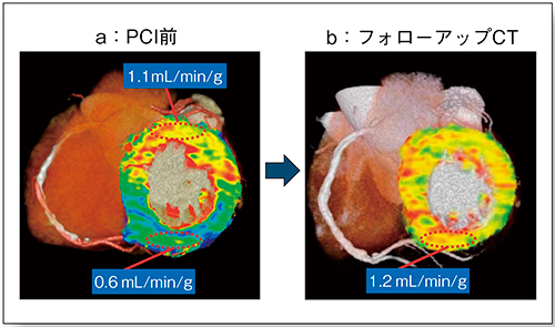 図3 PCI 前後の心筋血流CT によるMBF定量評価