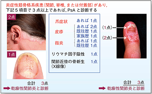 PsAの診断には,CASPAR分類基準を使用する(図1)。炎症性筋骨格系疾患(関節,脊椎,または付着部)があり,爪症状,皮疹,指炎,リウマチ因子陰性,X線画像で関節近傍の骨新生像があることで点数をつけ,3点以上でPsAとなる。X線画像での骨新生像は,初期の段階では見つからないことが多い。