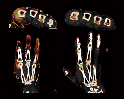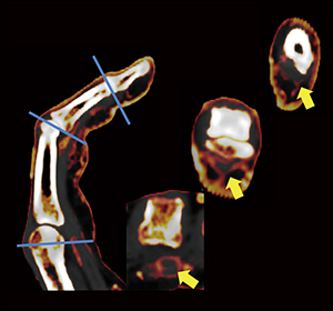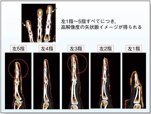 DECTによるヨードマップ画像の利点としては,PsA好発部位であるDIPの画像を鮮明に各指で評価が可能なことである。図2のように,5指すべてに高解像度の矢状断画像を作成でき,炎症の診断が可能である。また,変型が強い関節でも,各関節に対応した横断像を作成して診断することができる(図3)。それによって,PsAの診断がより正確になり,視覚的に治療評価が可能となった。