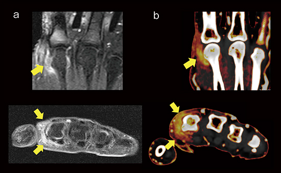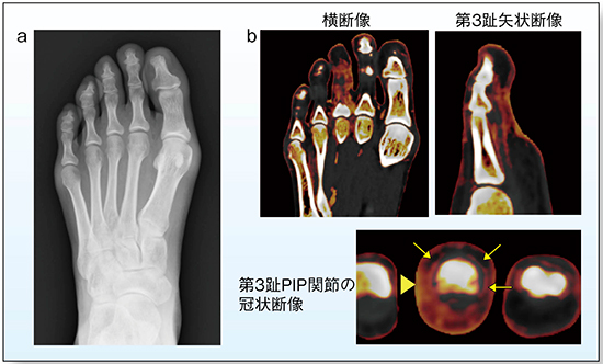 症例1は,24歳,女性。乾癬発症は14年前で,1年前から生物学的製剤を投与し,半年前から休止中。1か月前から皮疹再燃とともに左足関節,左第3〜5趾DIP関節,左膝関節などに疼痛が出現した。単純X線写真ではほとんど変化は見られないが(図4 a),DECTでは第3趾の屈筋腱腱鞘炎と,PIP関節の足底側の関節周囲炎が認められ,趾全長にわたる炎症性変化があり,指炎の状態になっていることがわかった(図4 b)。