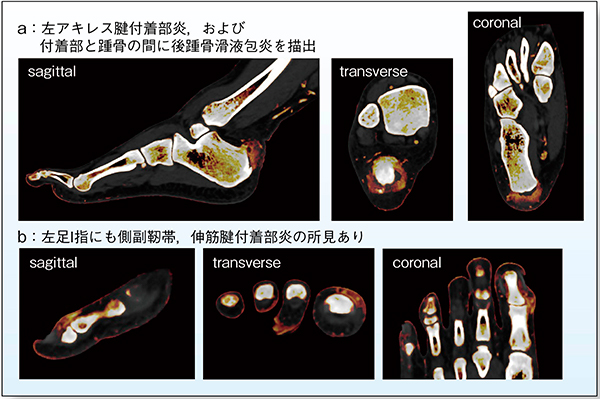 症例3は,38歳,男性。14年前から尋常性乾癬を発症,6年前より手指などに関節痛が出現している。アキレス腱に痛みを訴え,単純X線写真を撮影したところ,左優位に両側踵骨のアキレス腱付着部に骨増殖像を認める。DECTでは,左アキレス腱付着部炎が描出された(図7 a)。付着部と踵骨の間に,後踵骨滑液包炎も同時に認められる(図7 a)。また,痛みの訴えは特に強くなかったが,側副靭帯や伸筋腱の付着部炎も同時に認められた(図7 b)。