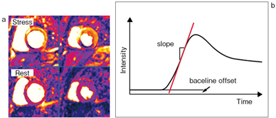 Perfusionには,“Perfusion slope map”の作成機能が搭載されている(図4)。これは,造影剤到達による心筋信号の立ち上がり曲線の傾きの大きさを表した,簡易的な血流情報を表している。この機能により,検査中に目視にて心筋信号の変化をより客観的に評価し,血流異常の診断を行うことが可能である。また,perfusionの検査は,通常1分以上の撮像が必要なため,浅い呼吸もしくは一部息止め検査にて施行される。そのため,一連の検査画像において被検者の呼吸による位置ズレが発生し,それが血流解析結果の不安定要素のひとつであった。しかし,このinline Perfusionには,オート・モーション・コレクション機能が搭載されており,位置ズレを補正することで,より精度の高い解析結果を提供できる。加えて,これまでこれらの解析に加味されていなかった,受信コイルによる感度不均一の影響を,プロトン密度強調信号を用いて補正する技術も備わっている。