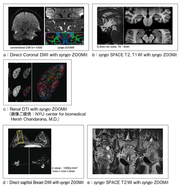 MAGNETOM Skyraは,パラレル送信(parallel transmit technology)を実現した送信プラットフォームであるTimTX TrueShapeを搭載し,局所選択励起(syngo ZOOMit)を実現した(図1)。対象領域(FOV)をslice方向,readout方向に絞ることが可能で,ズーム部分のB1シミング(図2)に加え,EPI法や3D TSE法(syngo SPACE)に応用できることから,新たな臨床診断の可能性が期待されている(図3)。