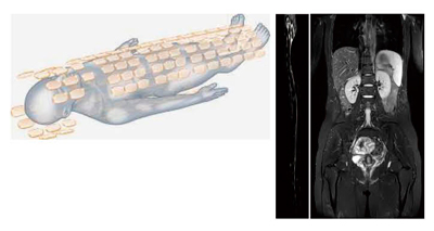 シーメンスは他社に先駆けて,送信・受信制御コンポーネントをMRガントリ内に搭載し,高い精度の送信管理に加え,高いMR信号を受信可能としたダイレクトデジタル変換を行い,3T装置の品質の向上に努めている(図4)。また,第4世代の受信コイルシステムであるTim4Gを搭載することで,最大204受信コイルエレメントを同時接続できるため,全身などの広範囲撮像に加え,救急診療での虚血性疾患や,脊髄外傷の責任病態精査を簡便に行える(図5)。
