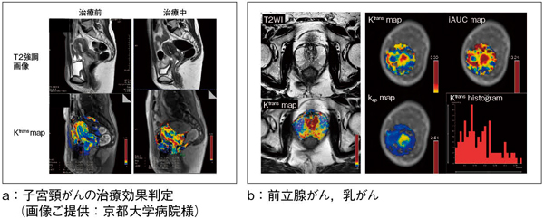 近年の腫瘍学における治療は目覚しい進歩を遂げており,遺伝子療法や分子標的療法,ホルモン・化学療法,粒子線治療法など従来の外科的治療に加え有用性が報告されている。そのため,MRI検査に求められる結果も複雑化しており,形態診断や広がり診断,良悪性診断に加え,前述したさまざまな治療前後の組織状態を定量的に把握できるバイオマーカーとして期待されている。シーメンスは先駆けて,薬物動態解析法であるToftsモデルを提唱し,MRIコンソールにsyngo Tissue4Dを搭載し,複雑で煩雑な解析手順を解消し,形態診断では評価できない組織内情報をワンクリックで提供する(図7)。